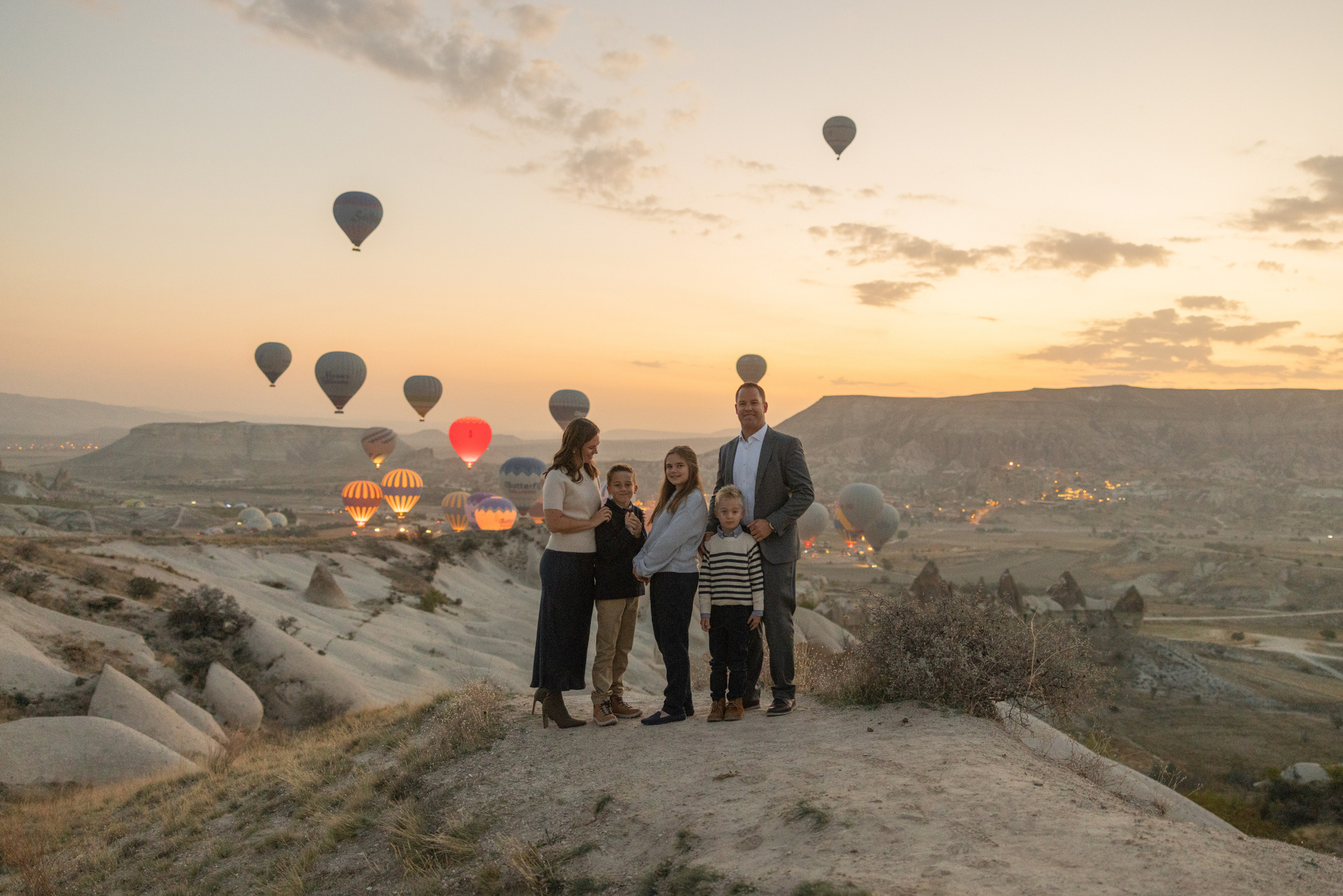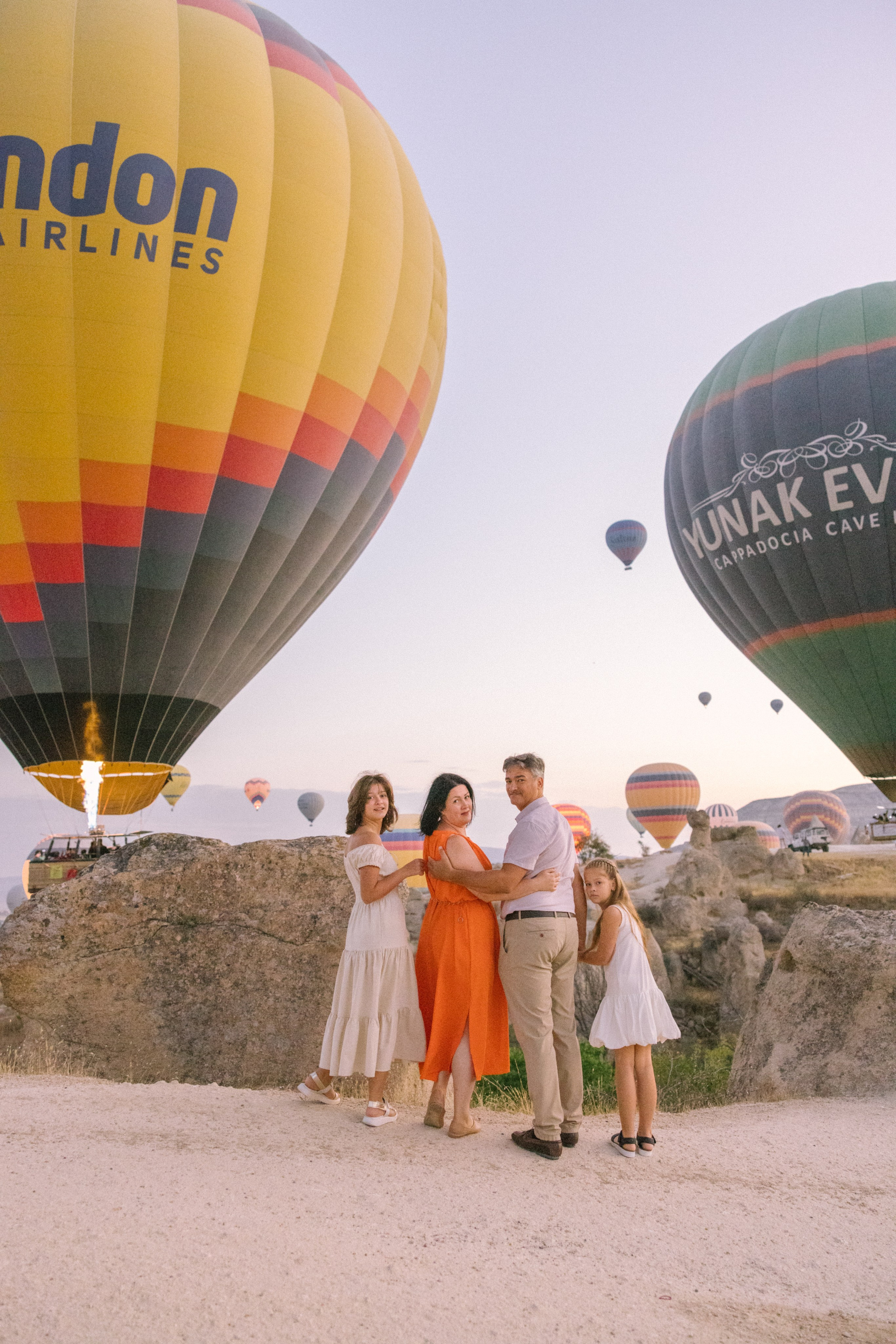 This family session began at sunrise, when Cappadocia is quiet and filled with soft golden light. As the hot air balloons slowly rose into the sky, the children watched with wonder, and the valley gradually came alive around them.