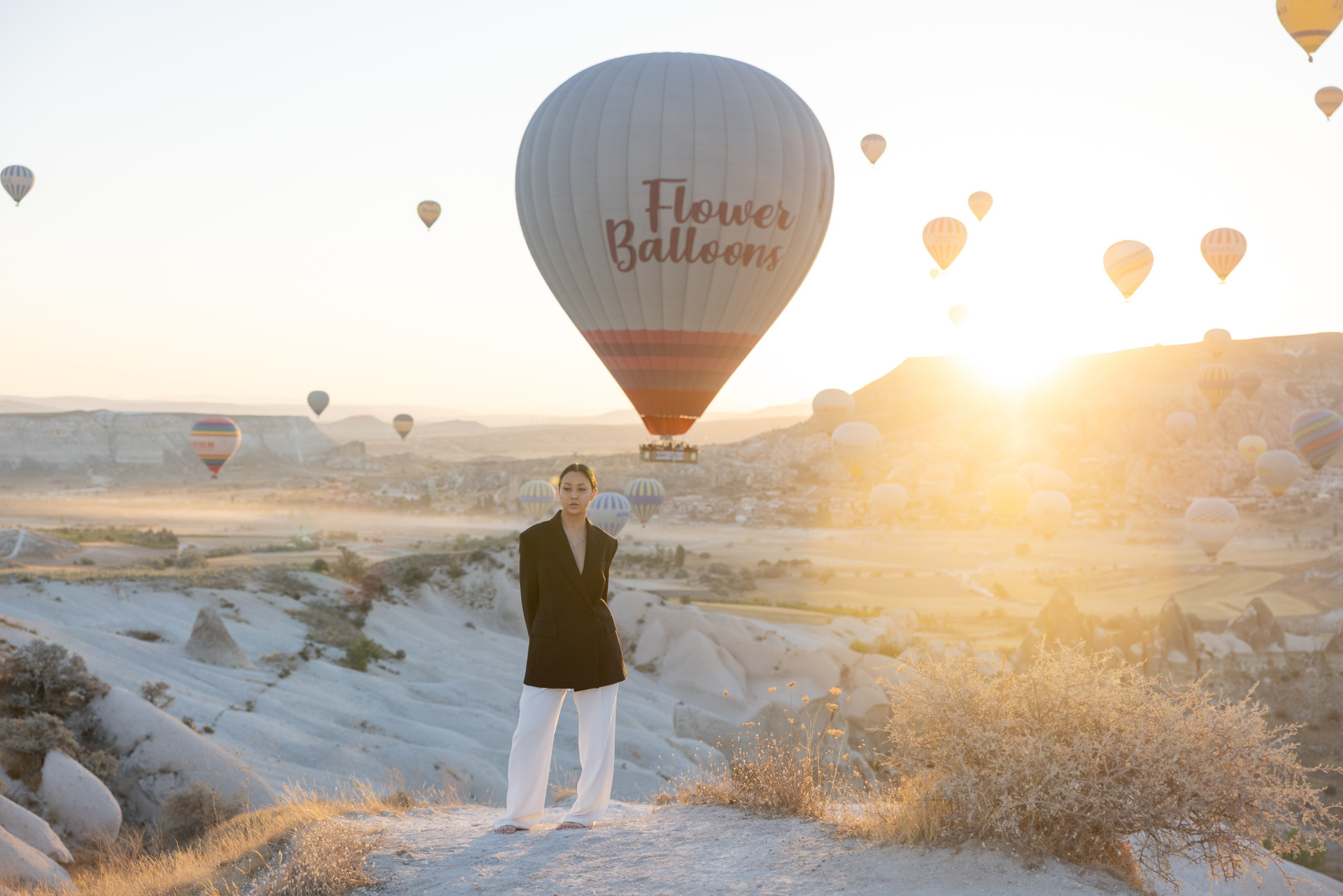 Sunrise is the most iconic time for a solo photoshoot in Cappadocia, especially with hot air balloons in the sky.