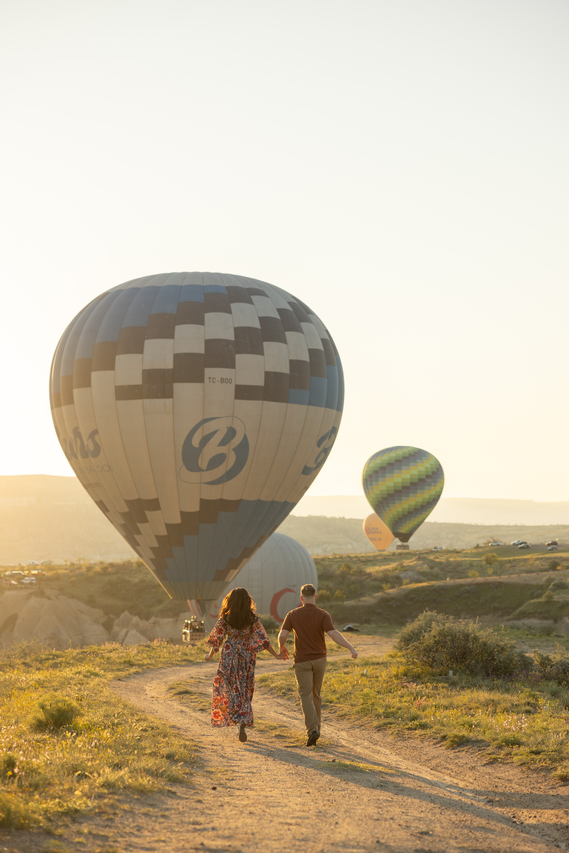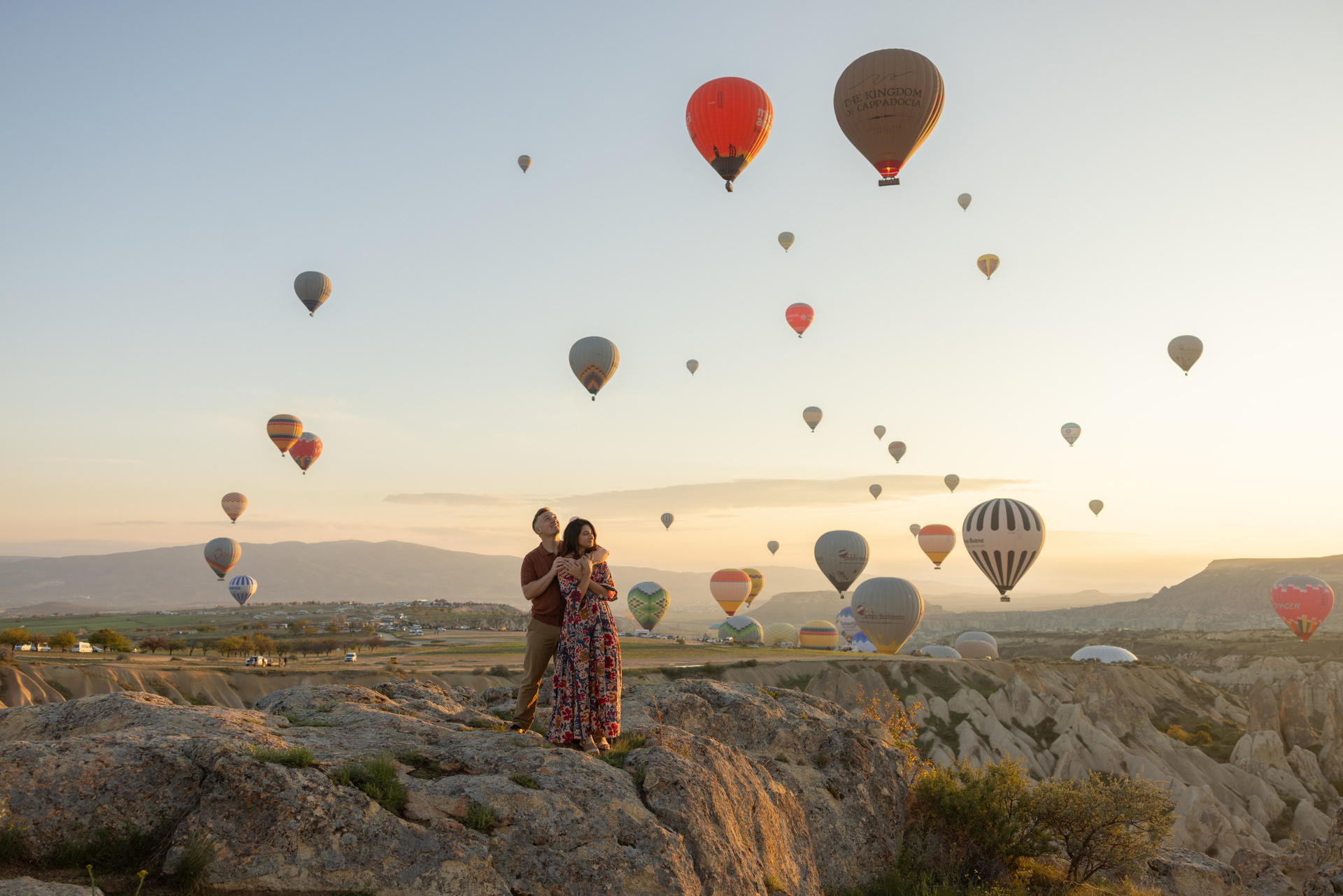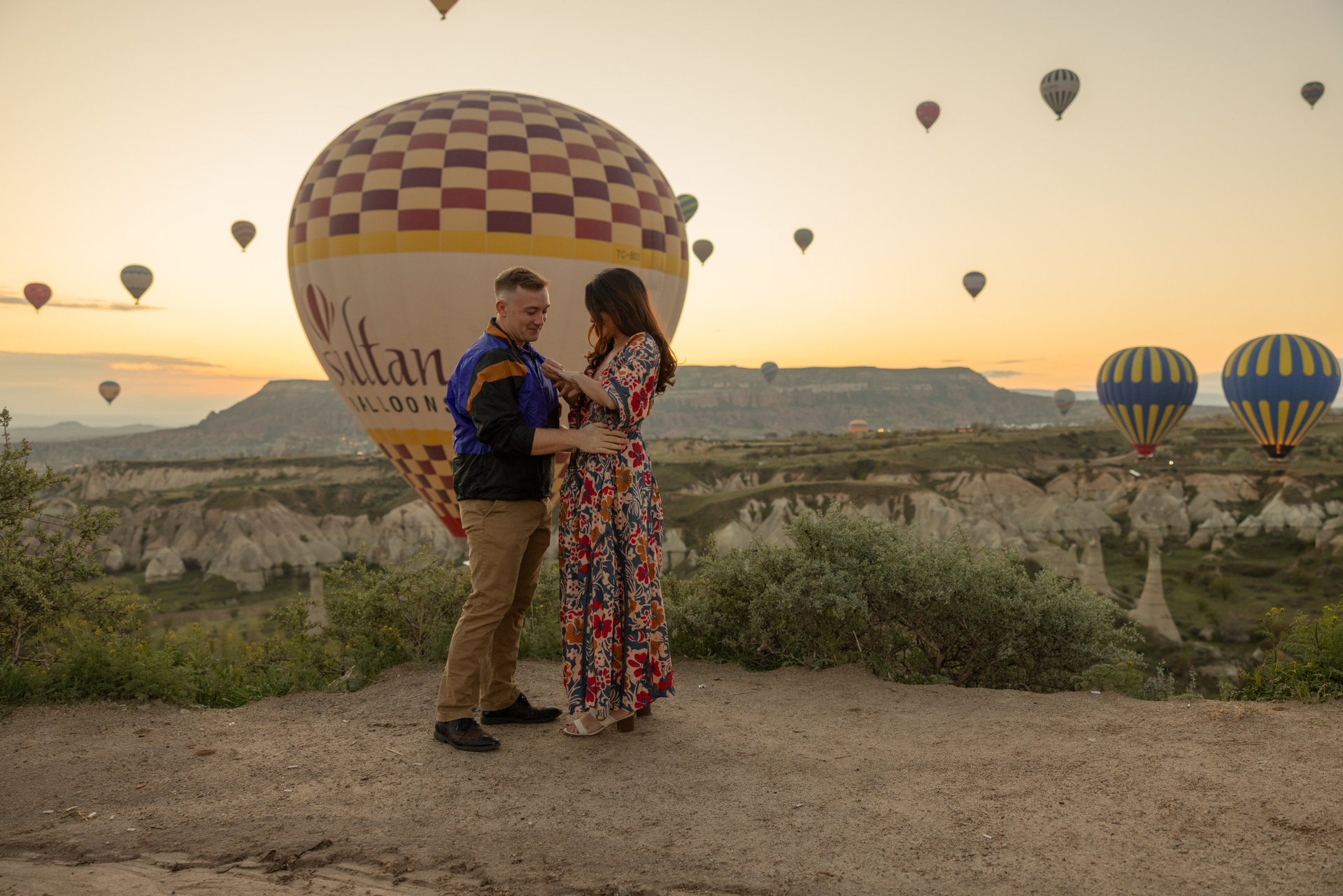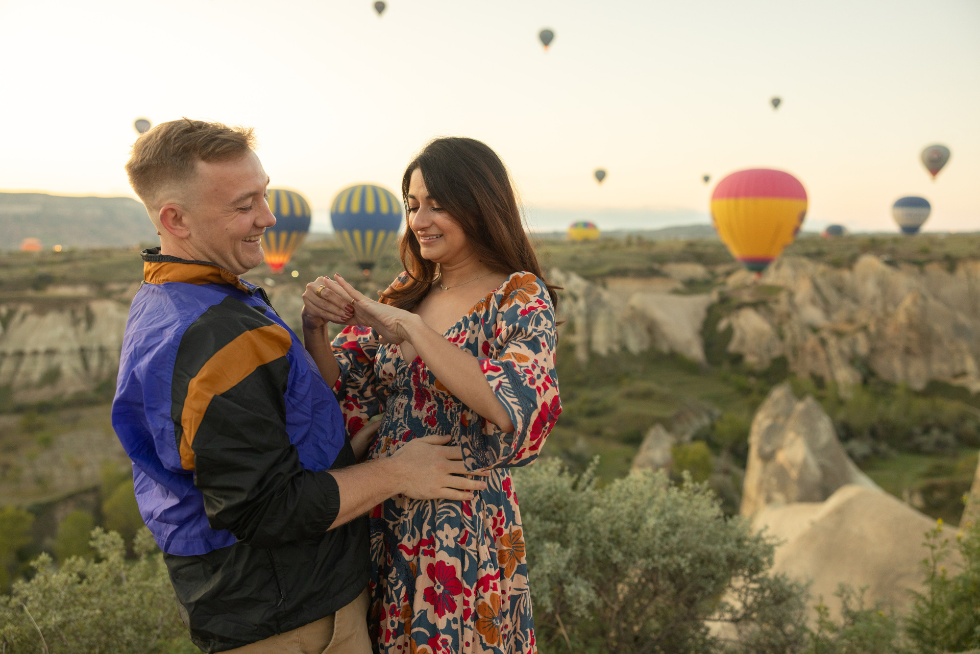 A sunrise couple photoshoot with hot air balloons in Cappadocia, ending with a surprise proposal above the valleys.
